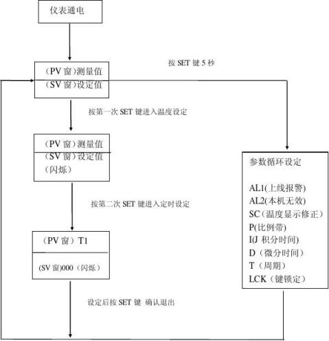 當(dāng)PV窗顯示T1時(shí),進(jìn)入定時(shí)設(shè)定,出廠時(shí)SV窗為0000,表示定時(shí)器不工作,如不需要定時(shí),即按SET鍵退出,如需定時(shí)1小時(shí),可用移位鍵配好加鍵把SV窗設(shè)定為0060,定時(shí)2小時(shí),設(shè)定為0120,以此類推。設(shè)定結(jié)束后,按SET鍵確認(rèn)退出。